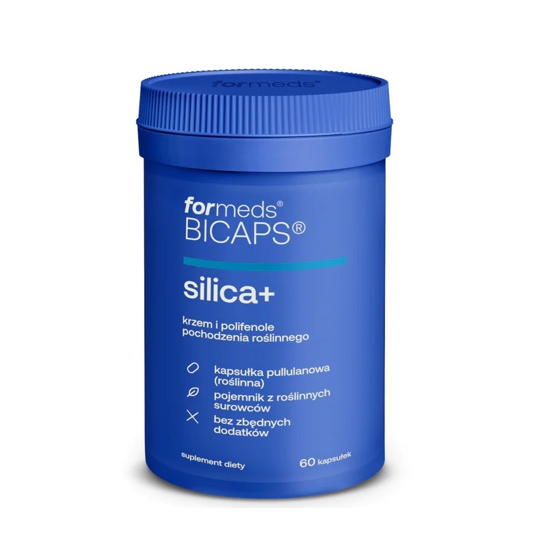BICAPS silica+ to połączenie krzemu pozyskiwanego z bambusa i skrzypu polnego z ekstraktem z pokrzywy zwyczajnej bogatej w polifenole. Linia BICAPS to suplementy diety bez zbędnych dodatków zamknięte w pullulanowej kapsułce roślinnej.