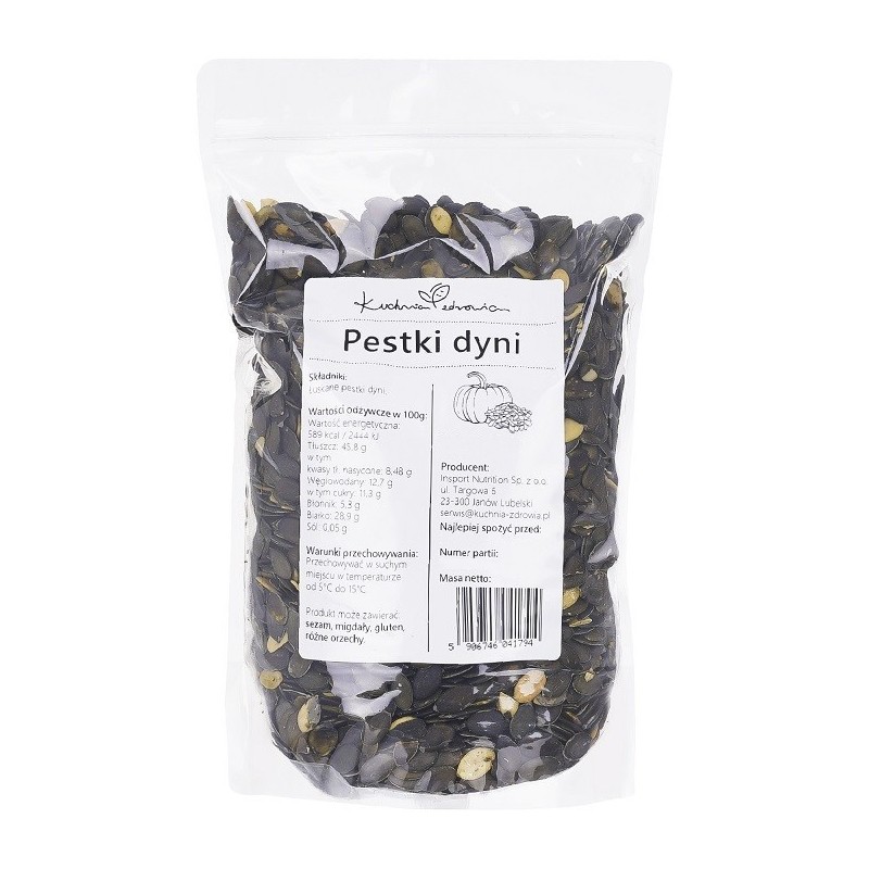 Pestki dyni firmy Kuchnia Zdrowia pochodzą z najlepszej jakości surowców, a dzięki odpowiedniej obróbce ziaren zachowują swoje walory smakowe i odżywcze. Pestki dyni są bogate w składniki mineralne, takie jak magnez, cynk, żelazo i fosfor. Magnez jest ważnym minerałem między innymi dla zachowania zdrowych kości, funkcji mięśni i układu nerwowego. Cynk jest ważny dla układu odpornościowego i zdrowej skóry, natomiast żelazo jest niezbędne do produkcji hemoglobiny w czerwonych krwinkach.