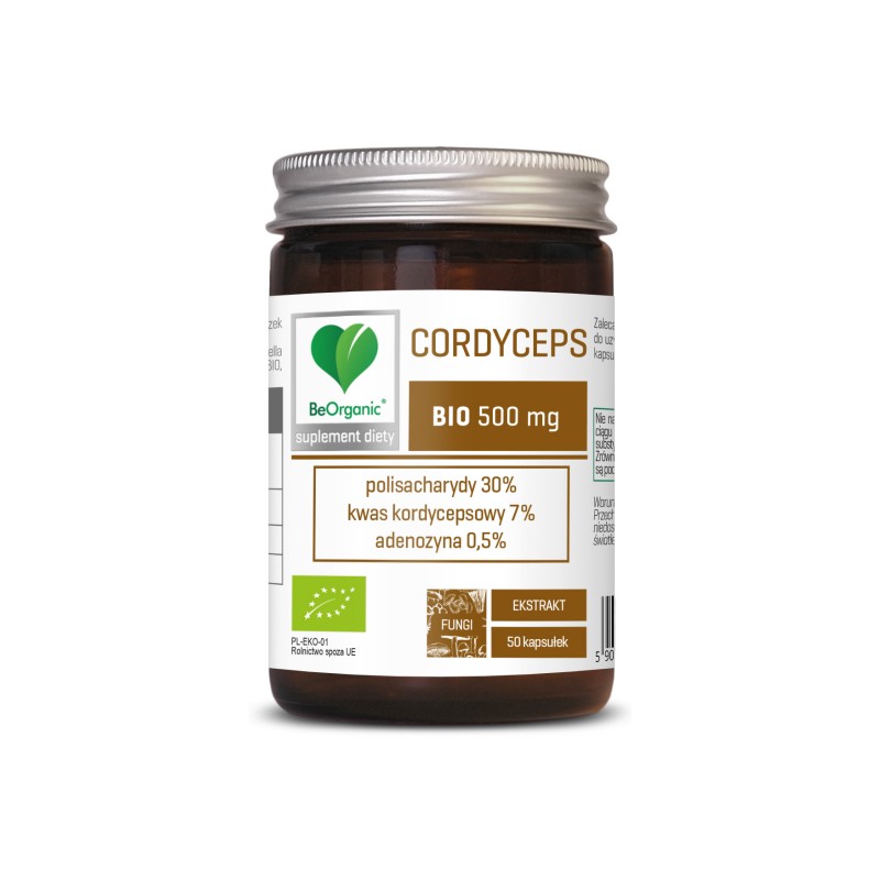 BeOrganic, Cordyceps BIO 500 mg powstał w oparciu o wysokiej jakości, ekologiczny standaryzowany ekstrakt z owocników grzybów Cordyceps sinensis, co gwarantuje zawartość aktywnych składników co najmniej na poziomie: