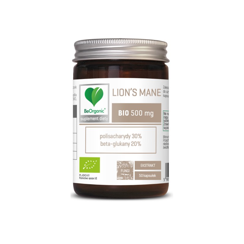 BeOrganic, Lion’s Mane BIO 500 mg powstał w oparciu o wysokiej jakości, podwójnie standaryzowany ekstrakt z owocników grzybów Hericium erinaceus, co gwarantuje zawartość aktywnych składników co najmniej na poziomie 30% wszystkich naturalnie występujących polisacharydów oraz 20% beta-glukanów.