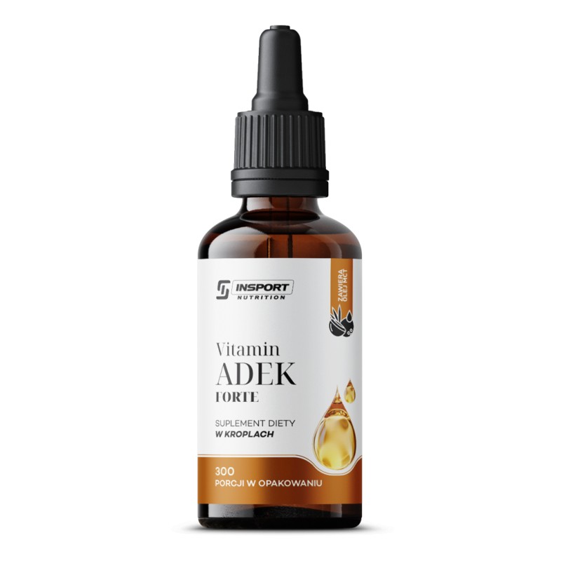 Insport Nutrition Witaminy ADEK Forte to suplement diety w kroplach, łączący cztery kluczowe witaminy rozpuszczalne w tłuszczach — A, D, E i K — w optymalnych porcjach, pokrywających dzienne zapotrzebowanie organizmu[1]. Dzięki zastosowaniu oleju MCT z kokosa składniki odznaczają się wysoką biodostępnością. Wygodna forma płynna umożliwia łatwe dawkowanie, co sprawia, że suplement jest odpowiedni zarówno dla dorosłych, jak i dla osób mających trudności z połykaniem kapsułek.