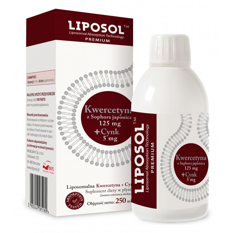 Liposomalna naturalna kwercetyna z perłowca japońskiego (Sophora japonica) 125 mg + Cynk 5 mg 250 ml została zamknięta w liposomach. Liposomy są małymi cząsteczkami (kuleczkami) lipidowymi, które powstają naturalnie w momencie kontaktu wody z lecytyną. Liposomy są łatwo wchłaniane przez organizm. Gdy kwercetyna rozpuszcza się w wodzie i miesza z lecytyną zachodzi proces enkapsulacji liposomalnej. Rezultatem jest lepsze wchłanianie kwercetyny we krwi.