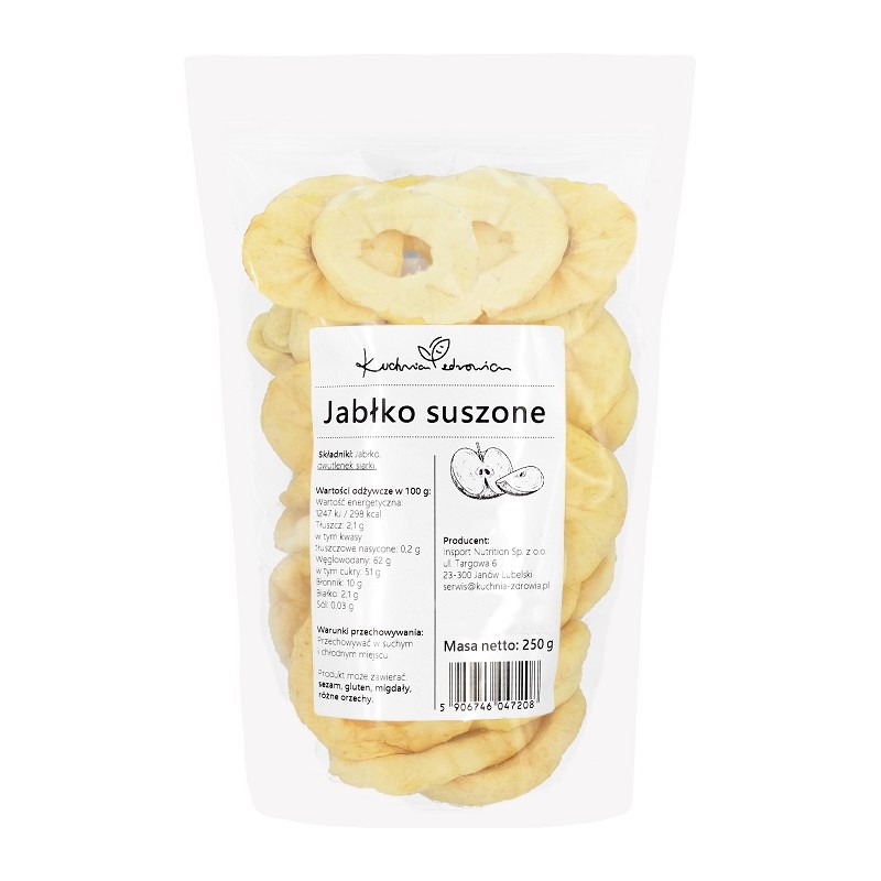 ✅Suszone jabłka Kuchnia Zdrowia to starannie wyselekcjonowane owoce, które poddano suszeniu w kontrolowanych warunkach. Dzięki temu zachowują swój wyjątkowy aromat oraz naturalną słodycz. Świetnie sprawdzą się zarówno w daniach słodkich, jak i wytrawnych.