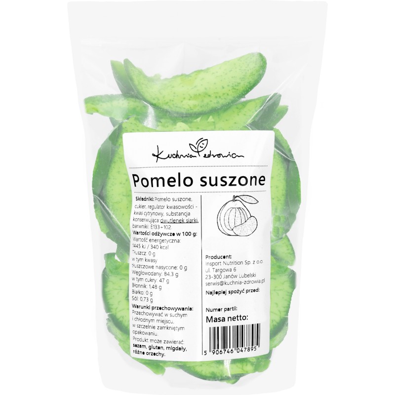 ➡️ Składniki: Pomelo suszone, cukier, regulator kwasowości: kwas cytrynowy, substancja konserwująca: dwutlenek siarki, barwniki: E133, E102.