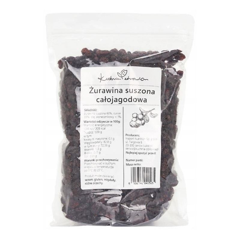 Składniki: Żurawina suszona 60%, cukier 39%, olej słonecznikowy <1%