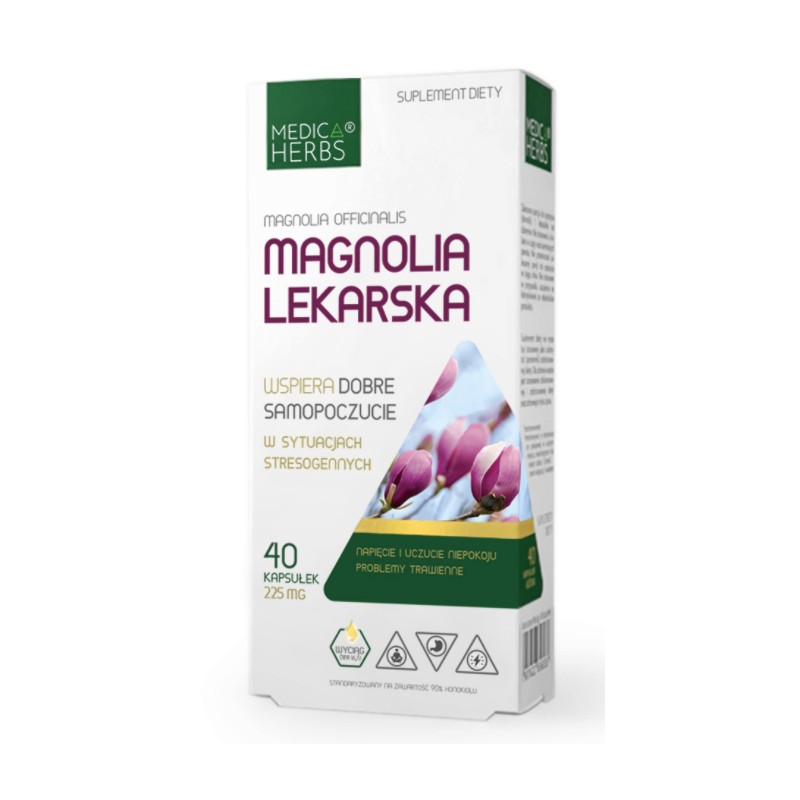 Magnolia lekarska (Magnolia officinalis) wspiera utrzymanie dobrego samopoczucia, również w sytuacjach stresu, które mogą powodować napięcie nerwowe, drażliwość i zmęczenie. Wspomaga prawidłowe funkcjonowanie układu pokarmowego, dzięki czemu może być pomocna przy dolegliwościach trawiennych związanych ze stresującym trybem życia.